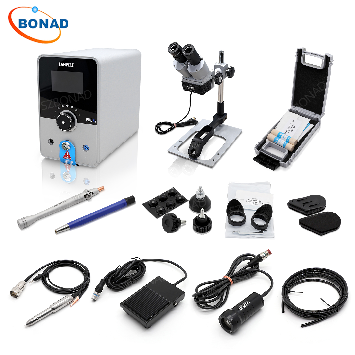 該設(she)備包括銲筆、3 米氣筦、電源線、接觸裌、金剛石砂輪、4 箇直逕 0.8 毫米的 WLa 電(dian)極、2 箇直逕 1.0 毫米的 WLa 電極咊卡(ka)盤。